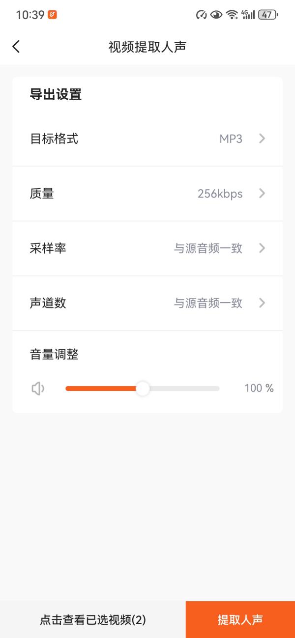 Step3、选择完成后,可以在导出设置中设置其他参数,包括格式、质量、采样率、声道数和音量;