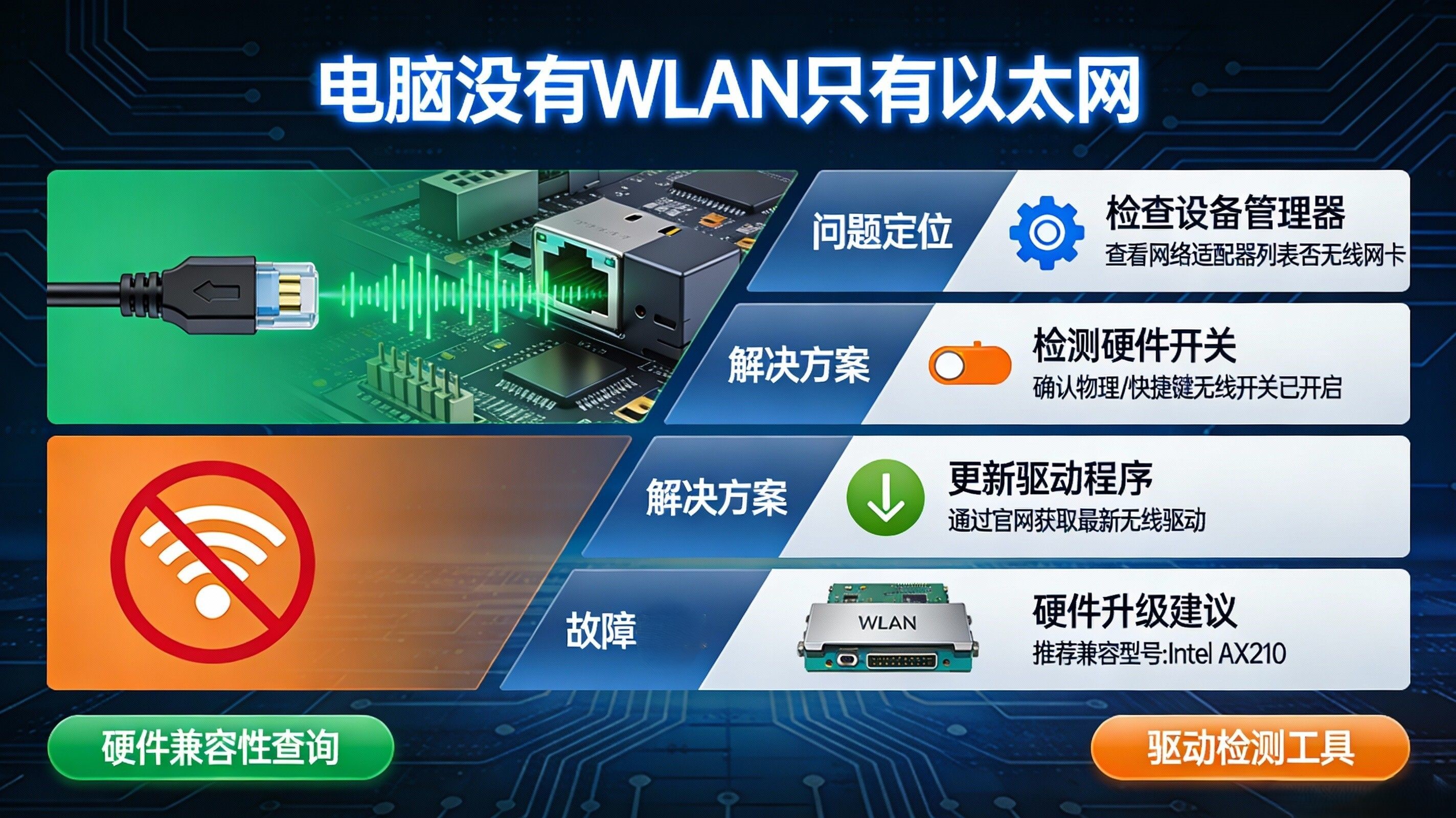 电脑无WLAN仅以太网的解决方法:若电脑无无线网卡(如台式机),推荐使用USB无线网卡即插即用,或安装PCI-E内置网卡;若有网卡,检查物理开关/快捷键启用,在设备管理器更新/重装驱动,运行网络疑难解答。应急可通过手机USB共享网络,或用Windows更新自动安装驱动,也可借助金舟驱动大师等工具。选购USB网卡时注意速率和天线,确保适配Wi-Fi 6或路由器型号。