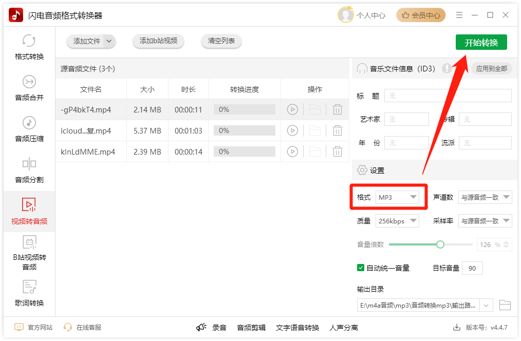 第二步:设置格式为mp3格式,并根据需要设置相关参数,最后点击“开始转换”即可。