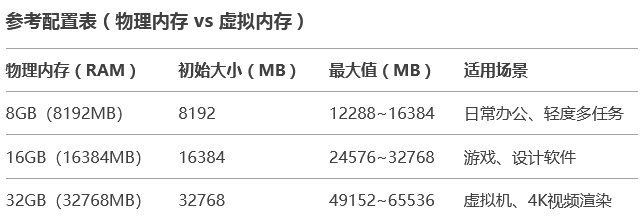 电脑常见的有8GB、16GB、32GB三种物理内存参数,可参考自身使用场景来设置虚拟内存初始值和最大值。