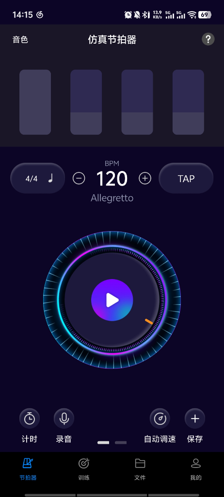 启动节拍器Pro后,你将直接进入“节拍器”功能页。这里提供“仿真节拍器”和“专业节拍器”两种模式,默认显示为仿真节拍器。你只需在屏幕上左右滑动,即可轻松在两种模式间切换。