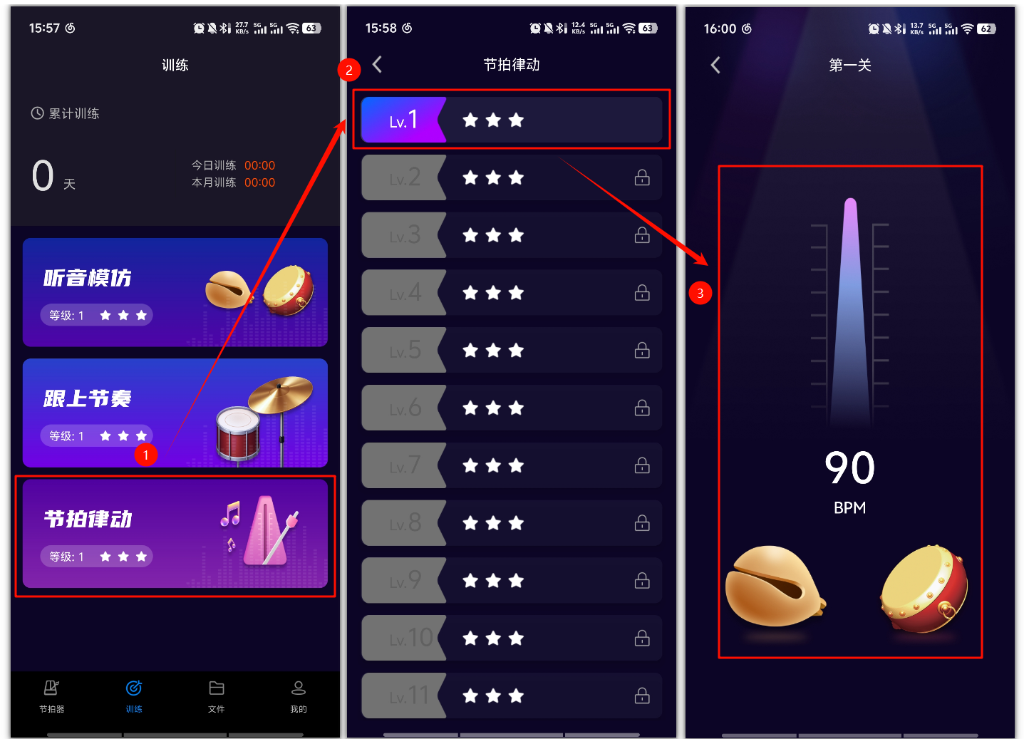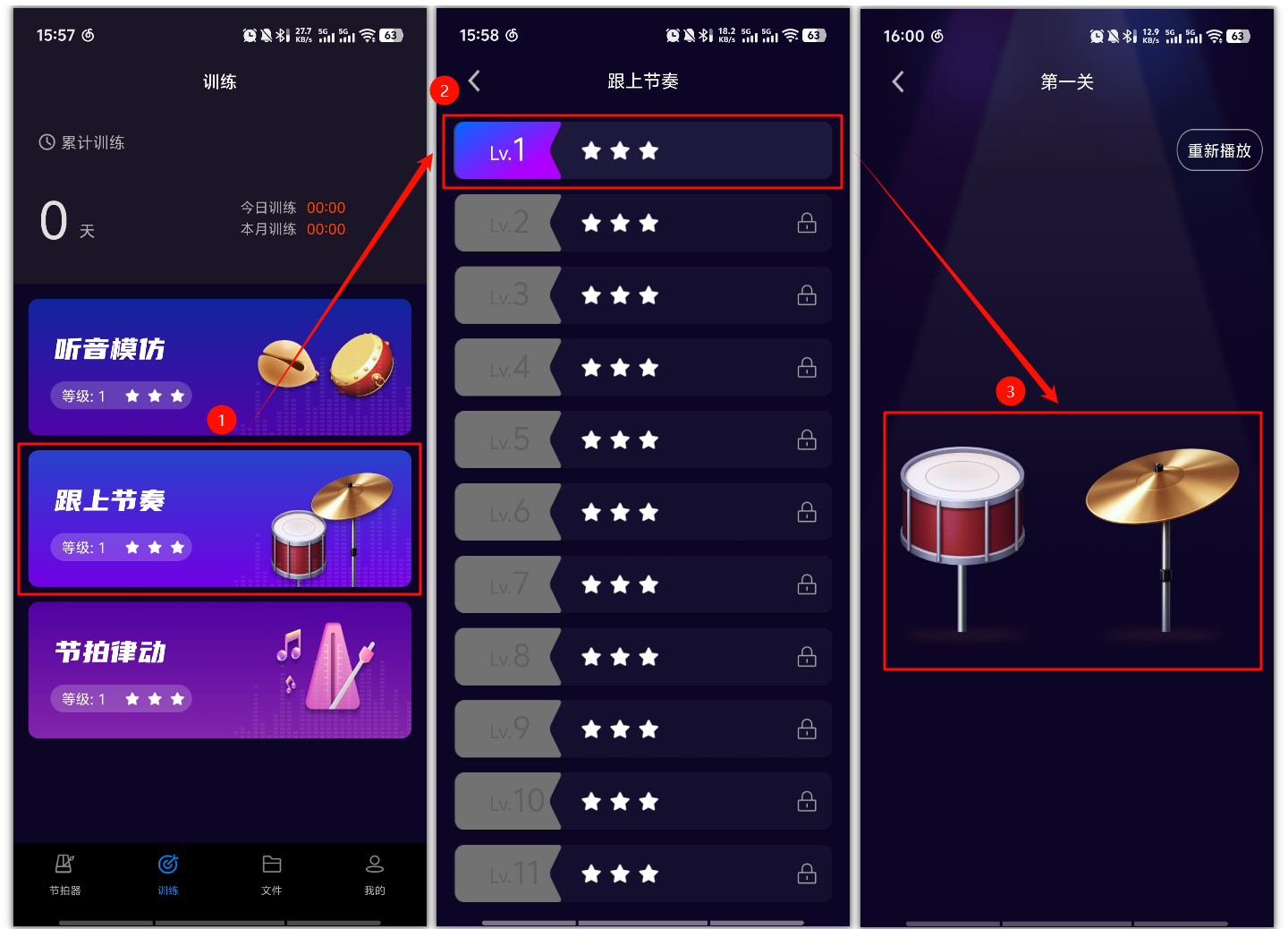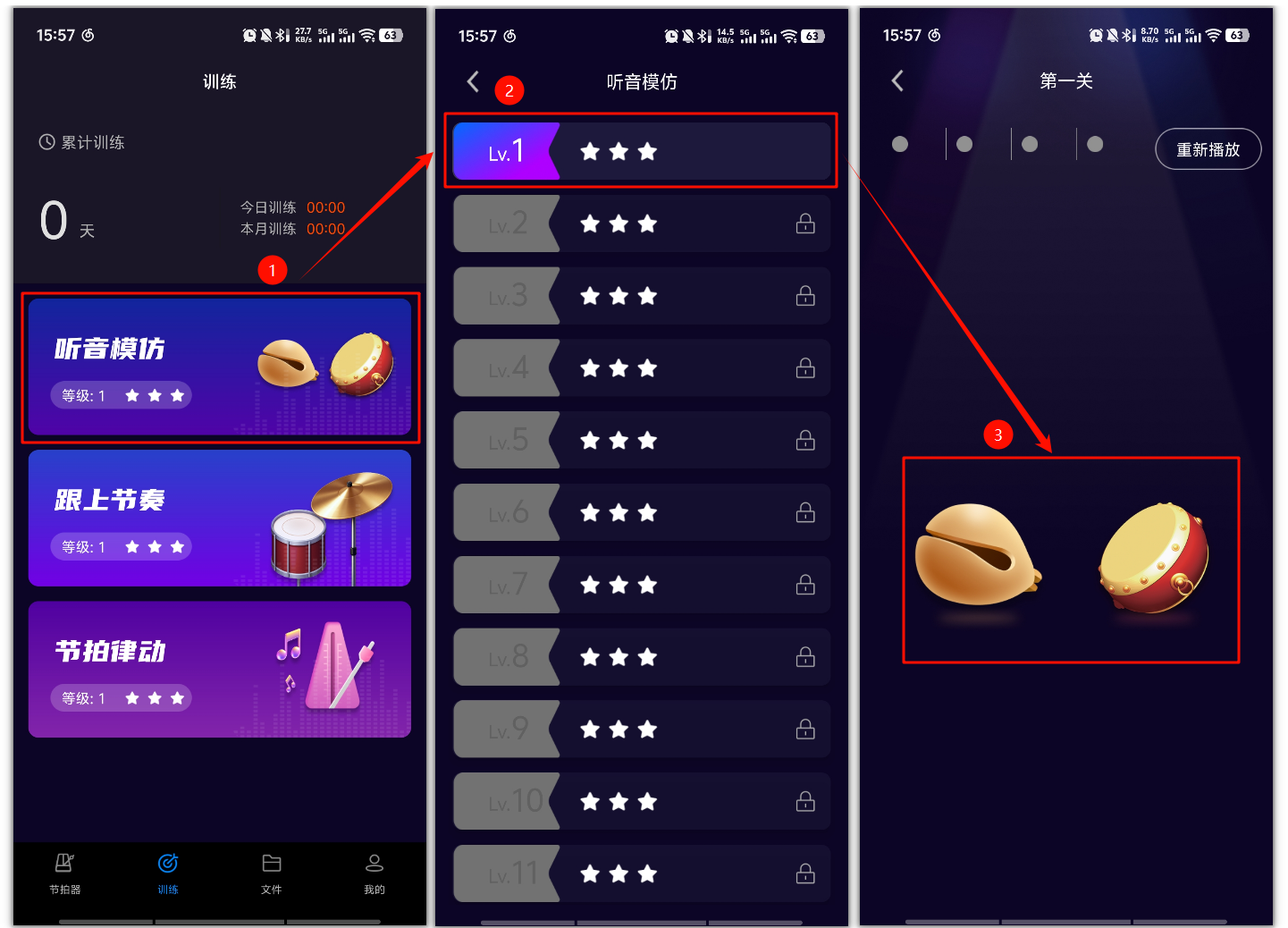 “训练”模块包括听音模仿、跟上节奏、节拍律动三种趣味闯关小游戏,帮助你在互动中提升节奏感与反应能力: