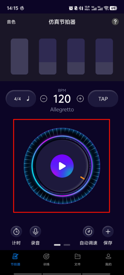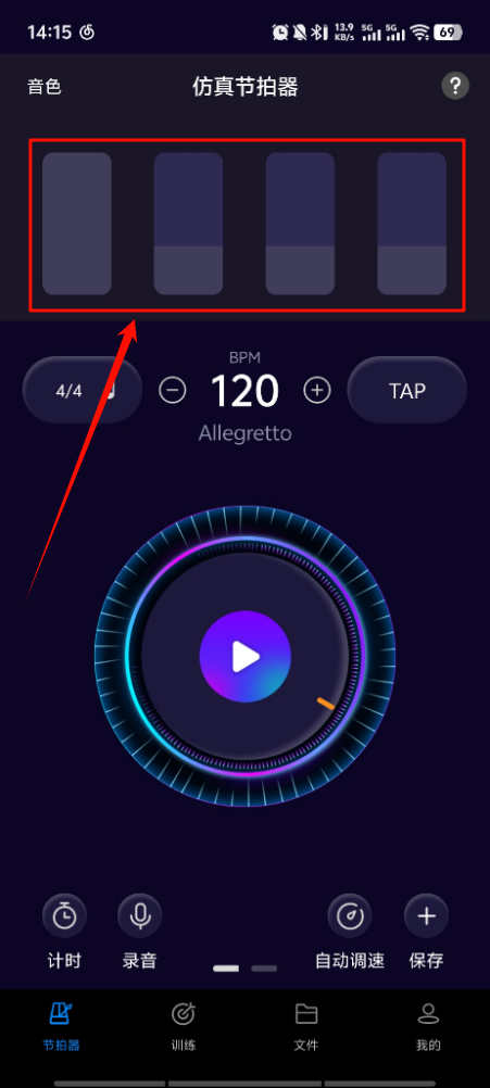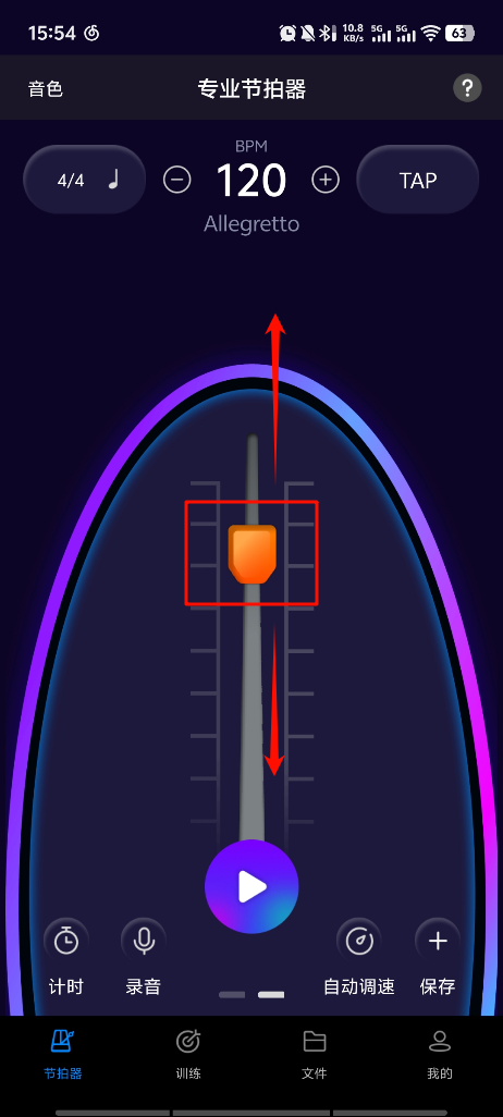 5.向左滑动屏幕,进入专业节拍器页面。上下滑动指针上的滑块,可以快速调整BPM值。