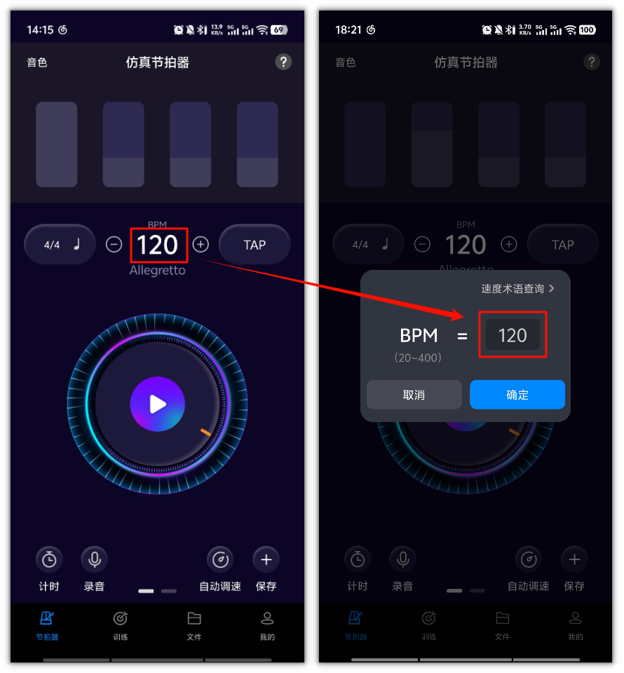 1.打开节拍器Pro,默认进入仿真节拍器页面。点击中间的BPM数字,可以直接输入BPM数值,调节节拍频率。