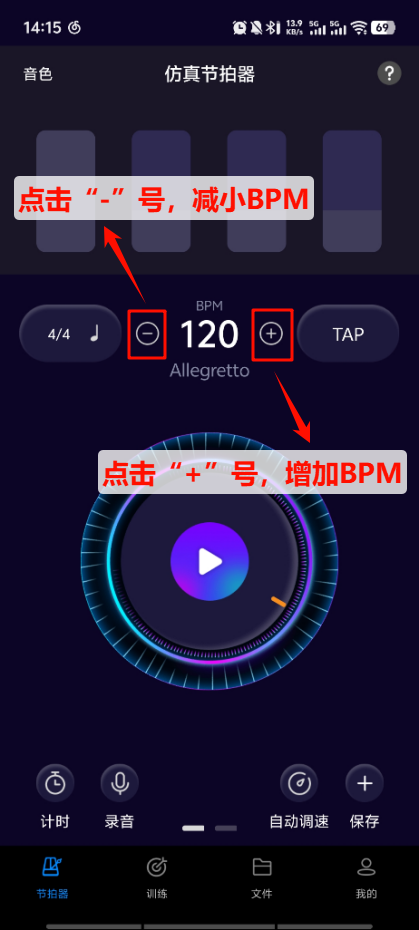 2.或者直接点击数字旁的“+/-”号,也可以调节节拍频率。点击左边的“-”号,减小BPM;点击右边的“+”号,增加BPM。