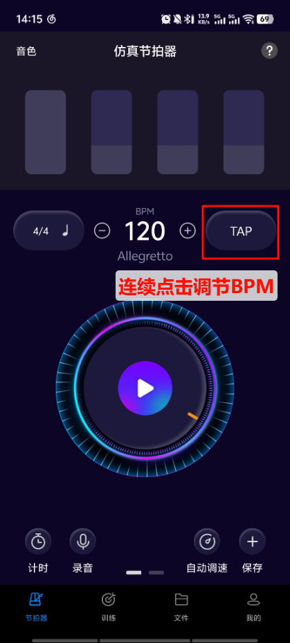 3.连续点击右侧的“TAP”按钮,也可调节BPM。