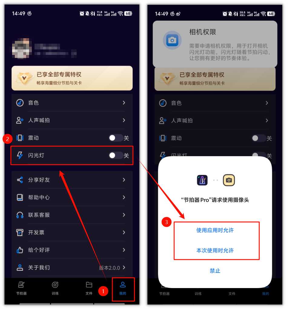 节拍器Pro支持相机闪光灯功能,闪光灯会随着节拍闪烁,帮助您获得更直观的节奏体验。开启该功能前,需先授权相机权限。具体操作如下: