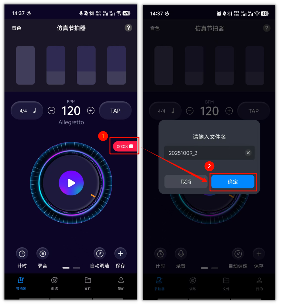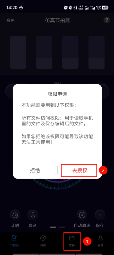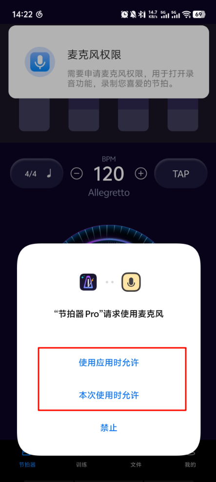 1.在节拍器页面点击“录音”,系统会提示需手动开启麦克风权限。