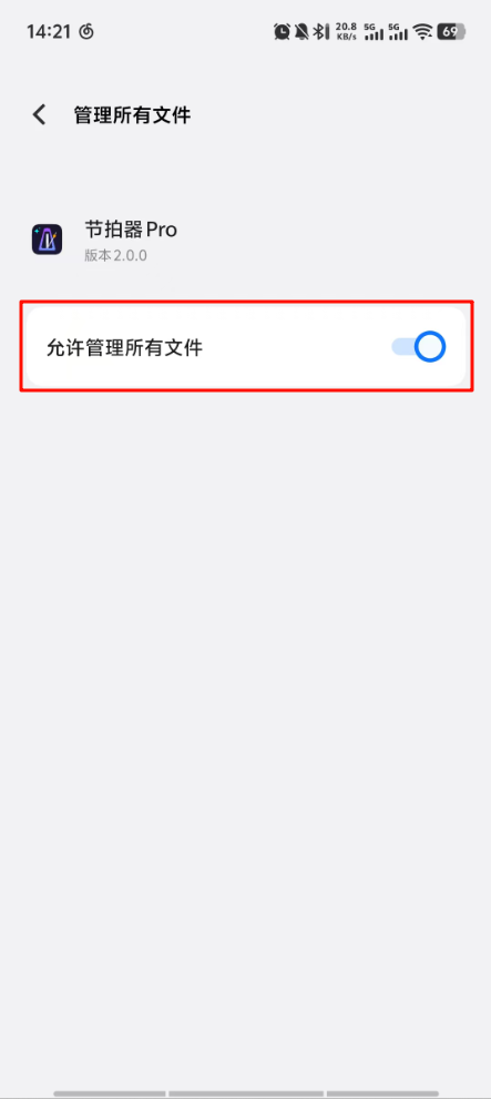 2.在管理所有文件设置页面中,勾选“允许管理所有文件”,完成后返回应用。