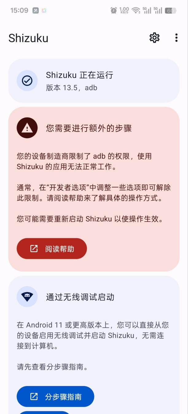 完成上述所有设置后,按照以下步骤启动Shizuku,配对仅需一次;之后手机重启后只需点击【启动】即可、无需再次进行配对。