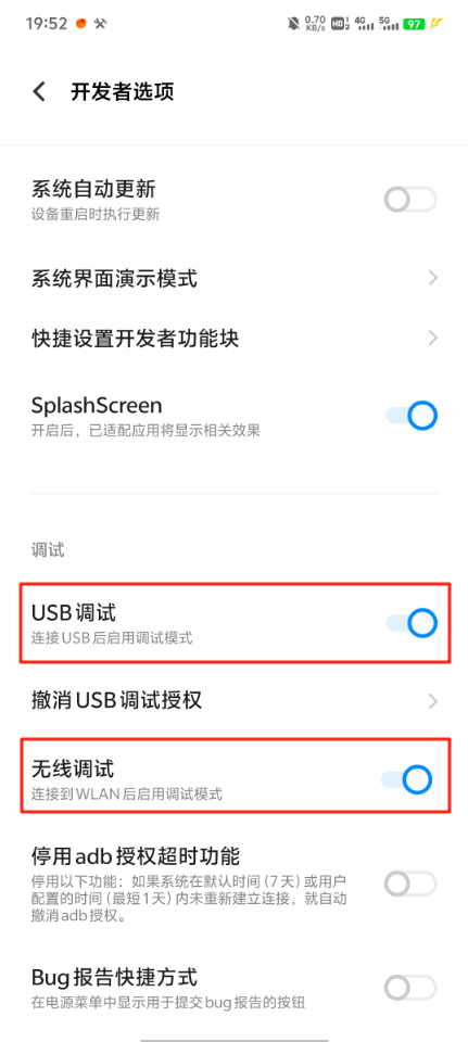 开启【USB调试】和【无线调试】