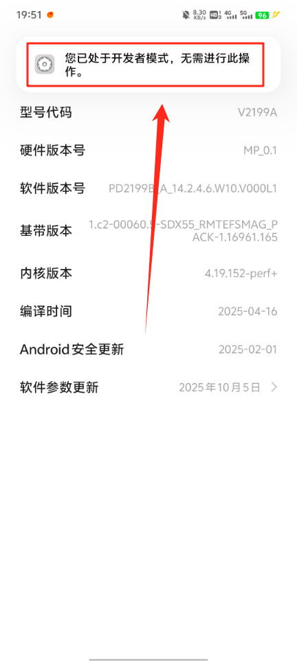 连续点击7次【版本号】,直到出现“您已处于开发者模式”的提示
