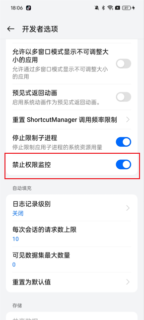 在【开发者选项】页面中关闭【权限监控】