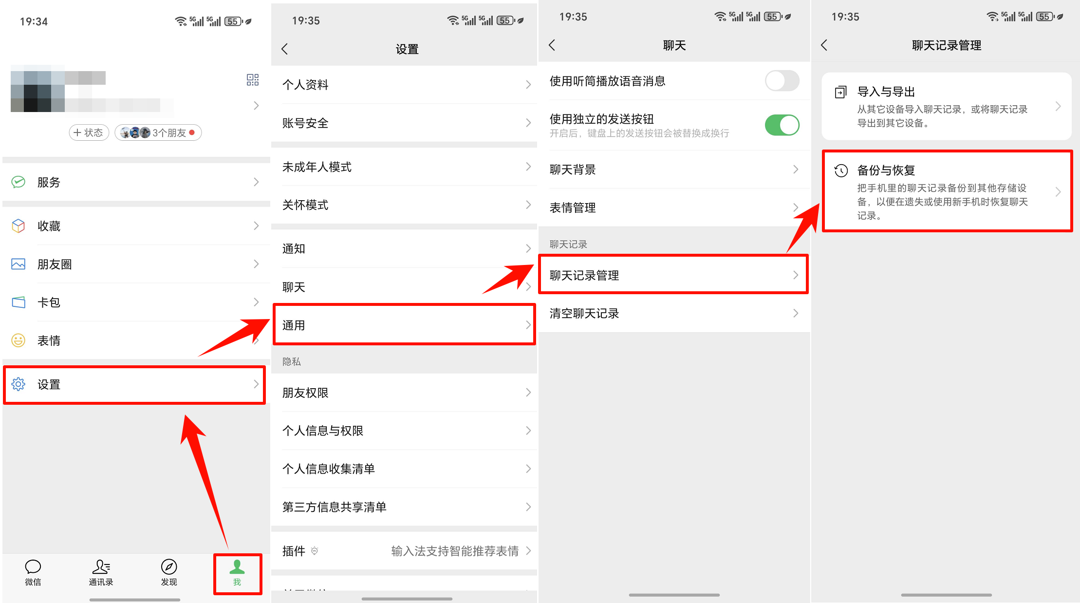 Step 1、回退微信版本之前,先要将手机微信聊天记录备份,以免造成数据丢失。微信内点击我 > 设置 > 聊天 > 聊天记录管理 > 备份与恢复,将记录备份到电脑或另一台设备
