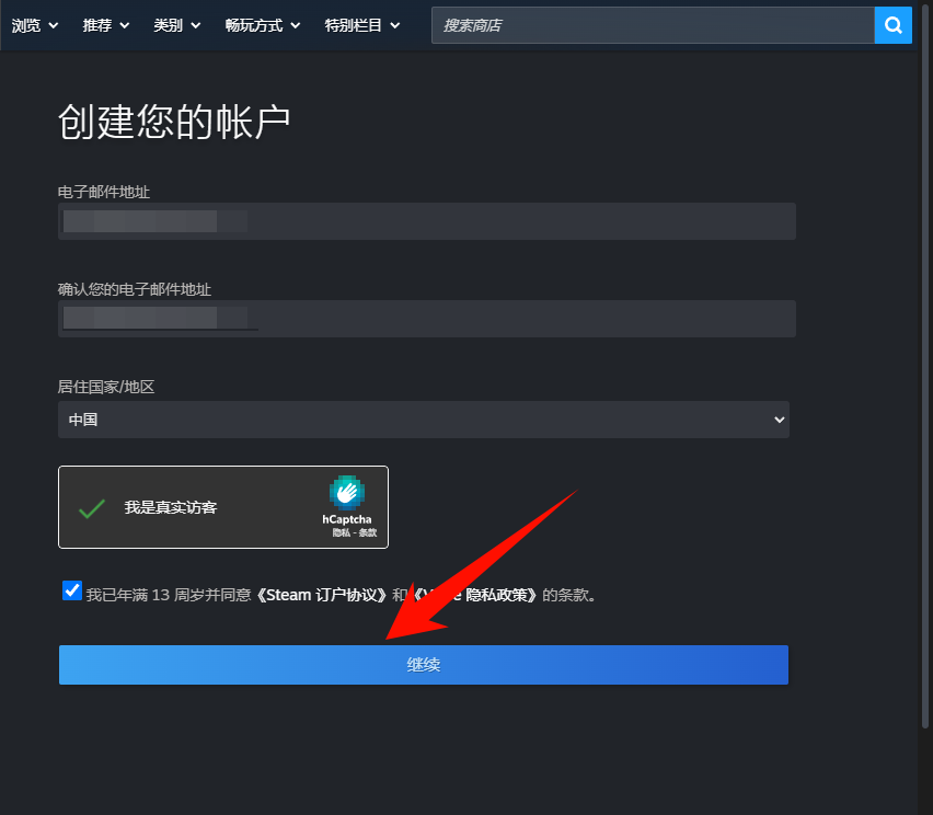5️⃣同意协议:勾选“我已年满13周岁并且同意《Steam用户协议》…”选项,点击“继续”。
