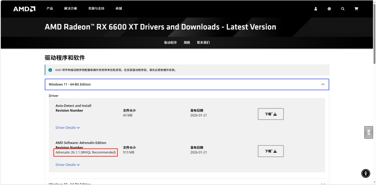 AMD驱动官网:https://www.amd.com/zh-cn/support/download/drivers.html