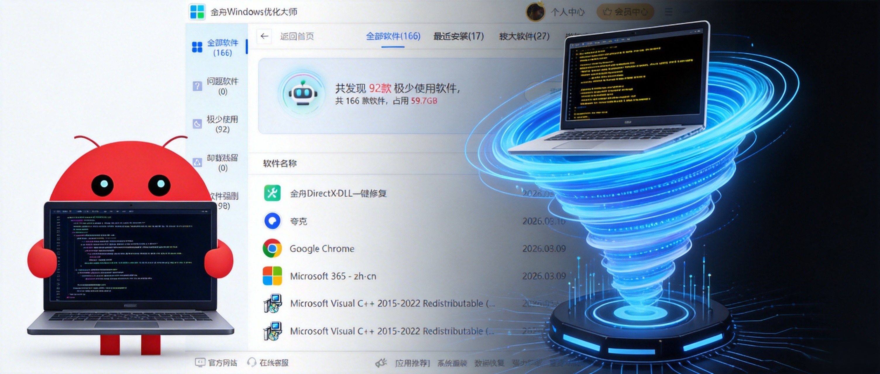 C盘瘦身清理、微信QQ清理、电脑一键优化加速、浏览器缓存清理,大文件搬家,一款轻量而强大的系统优化工具,轻松解决C盘爆红问题